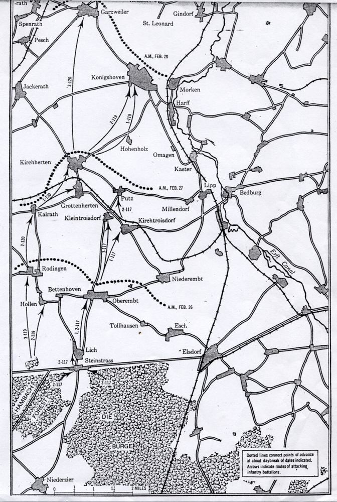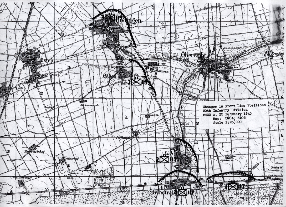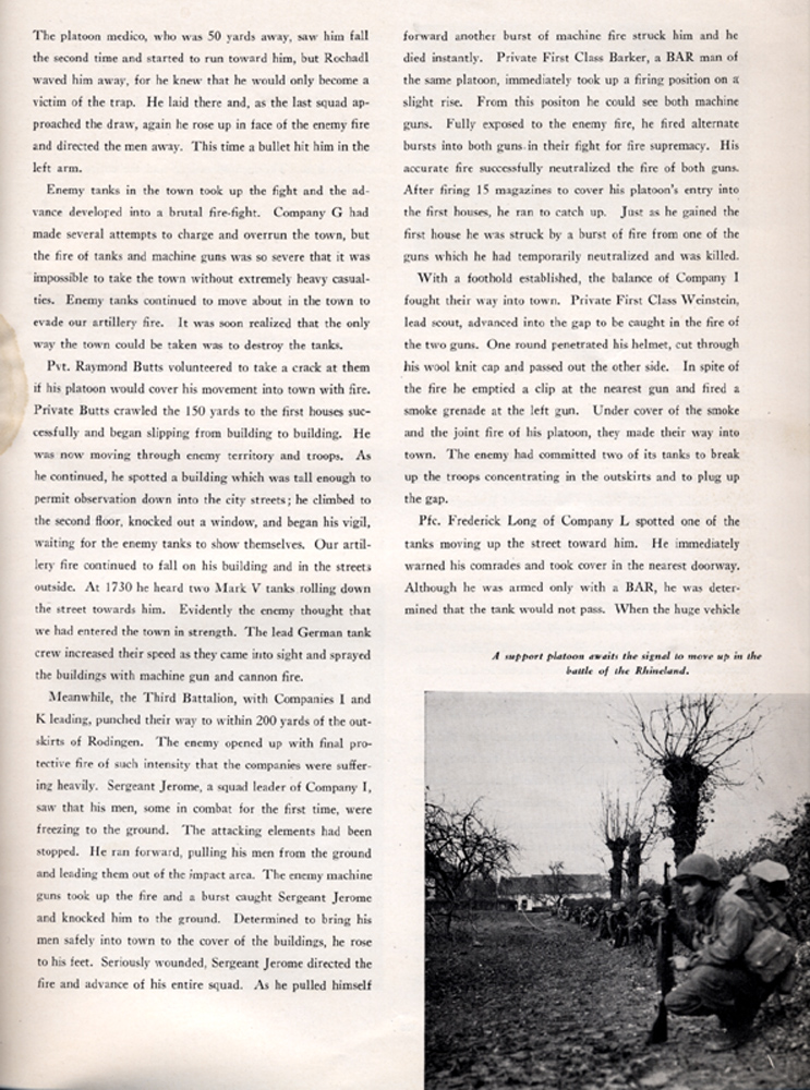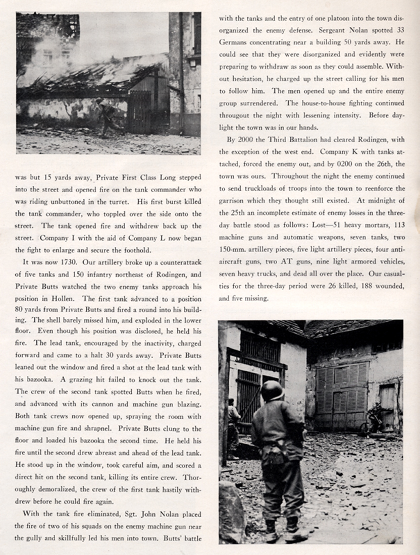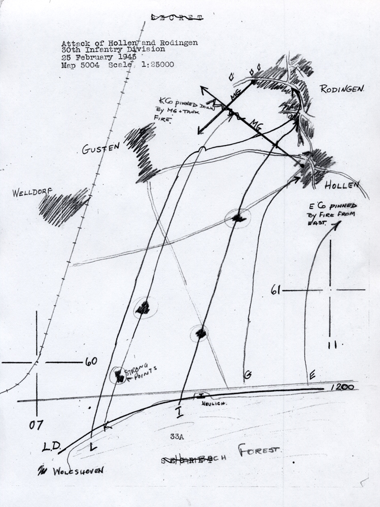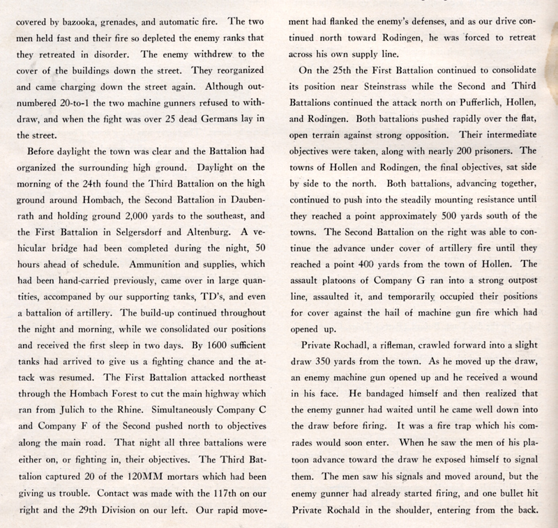 The attack on Hollen started from positions about 1/2 mile away. It was over open ground but we had 26 Sherman tanks that we marched between. That is not always a good thing....16 tanks were lost in the attack. I remember a Panther tank taking position in an orchard on the outskirts of Hollen. It was shooting solid shot rounds. A shell knocked an open hatch off the Sherman right next to me. If it had not been solid shot, I'd be dead. It sure did shake up the tank commander whose head was in the opening. The Germans or German civilians had dug 5 foot deep slit trenches about 40 yards in front of the first houses. My platoon was able to occupy these trenches as the Nazis' fled back to the houses during our advance. The Panther crew was very aggressive though...as most all of the German tank crews were...and would not retreat its orchard position. I always preferred anti-tank rifle grenades and thought I'd take a crack at the Panther. Well I missed the tank but brought a tree branch down on the tank commanders head. This did not make him too happy and the Panther preceded to try and bury the platoon in the trench. Lt. Giblin sent lead scout Hall from VA into the town first. Before Hall left he offered the Lt. some of his chewing tobacco to 'calm' his nerves and off he went. Pvt. Raymond Butts also entered the town with a bazooka. He was able to get to a second floor position and shot a round into the Panther's turrent. As the crew tried to escape the burning tank, Lt. Giblin used his 'grease' gun to eliminate them. Pvt. Butts earned the Distinguish Service Cross for his action.